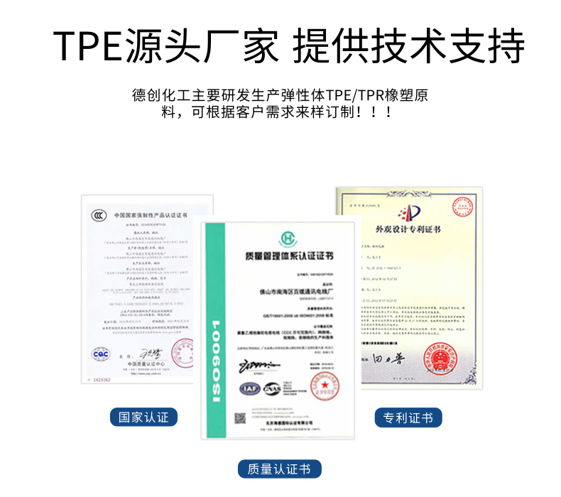 東莞市德創(chuàng)化工有限公司是一家專業(yè)研發(fā)生產熱塑性彈性體TPE/TPR橡塑原料生產廠家,我們可以根據客戶要求和機械性能為您量身定制專屬您的TPE/TPR橡塑原料,自然我們也可以為您節(jié)約成本,提升產品競爭力,需要了解更多關于TPE/TPR橡塑原料請來電咨詢洽談!